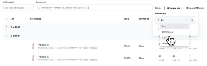 Vous avez la possibilité de voir votre stock à la SSCC en cliquant sur "Grouper par" en haut à droite et en sélectionnant la SSCC.