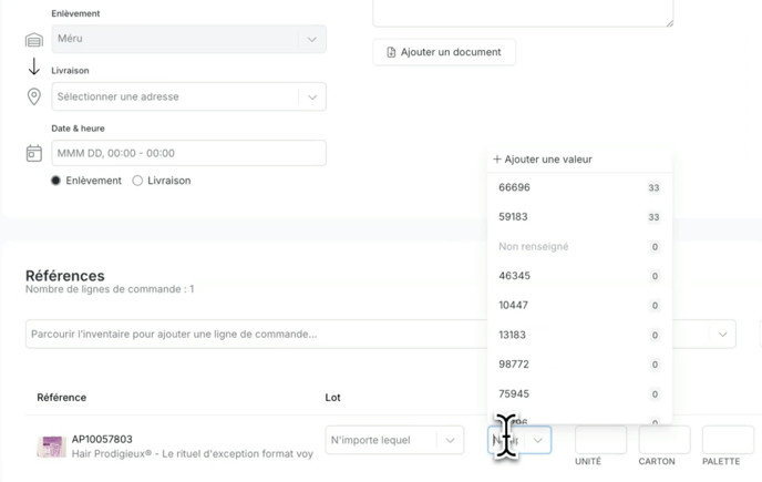 Lors de la création d'une nouvelle commande, vous aurez la possibilité de sélectionner une SSCC particulière pour pouvoir choisir le stock que vous souhaitez sortir de l'entrepôt.
