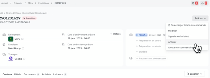Vous avez la possibilité d'annuler une commande lorsque son statut est en créneau à confirmer, créer, planifier ou en brouillon.