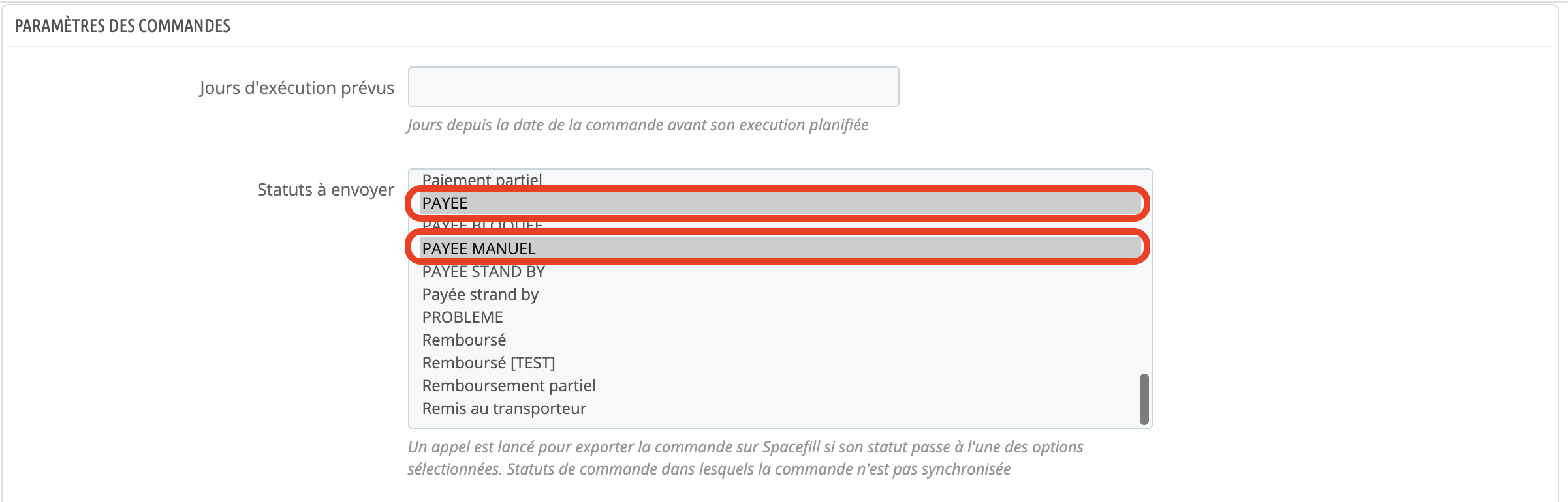 Statuts à envoyer : Sélectionnez les statuts de commande à envoyer à Spacefill. Un appel est lancé pour exporter la commande sur Spacefill si son statut passe à l'une des options sélectionnées. Par exemple, sélectionnez le statut "Payée".