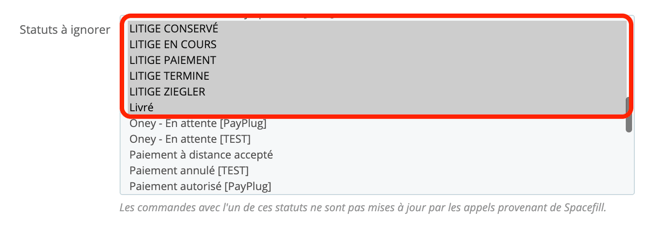 Statuts à ignorer : Sélectionnez les statuts de commande dans lesquels la commande n'est pas synchronisée. Les commandes avec l'un de ces statuts ne sont pas mises à jour par les appels provenant de Spacefill. Par exemple, sélectionnez le statut "Litige conservé".
