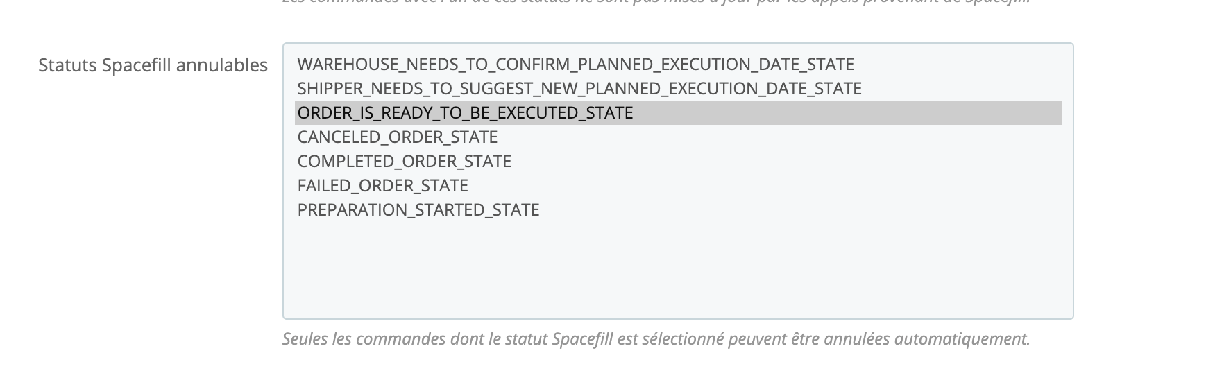 Statuts Spacefill annulables : Sélectionnez les statuts Spacefill dans lesquels la commande est encore annulable. Seules les commandes dont le statut Spacefill est sélectionné peuvent être annulées automatiquement. Par exemple, sélectionnez le statut Spacefill "ORDER_IS_READY_TO_BE_EXECUTED_STATE".