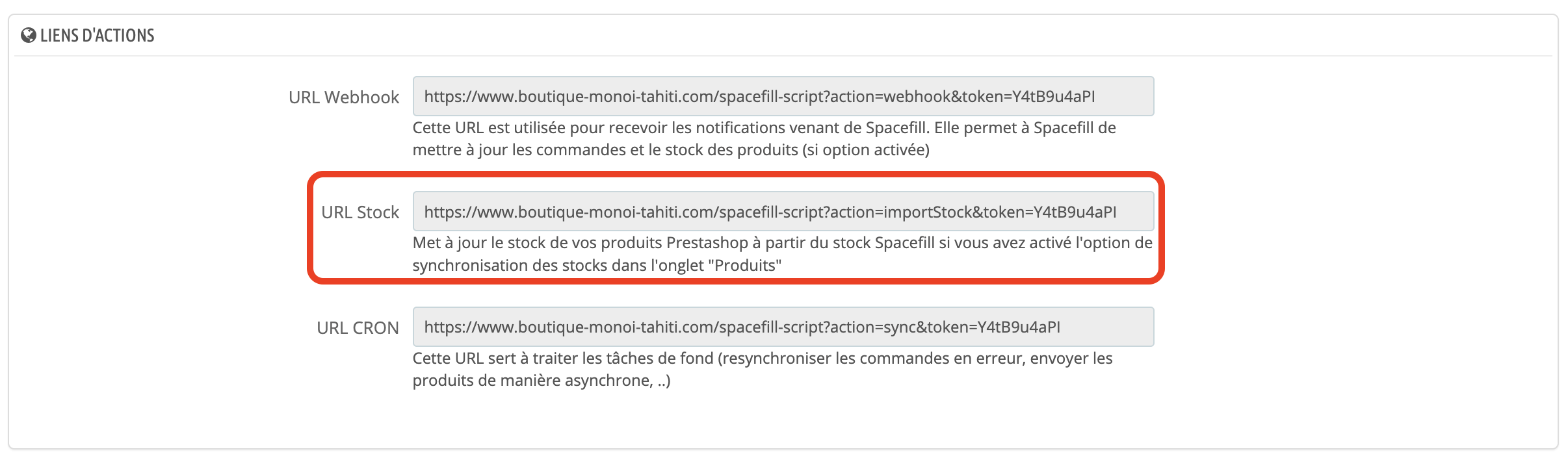 Via le module Spacefill dans Prestashop, Spacefill met à la disposition de ses clients un "endpoint" permettant de déclencher la mise à jour de l'état des stocks à échéance régulière. Par défaut, la totalité de l'état des stocks est synchronisée.