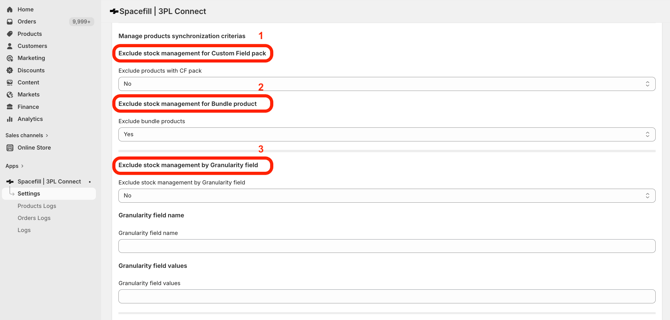 Pour exclure la synchronisation des stocks via les granularity field, depuis l'interface Shopify :